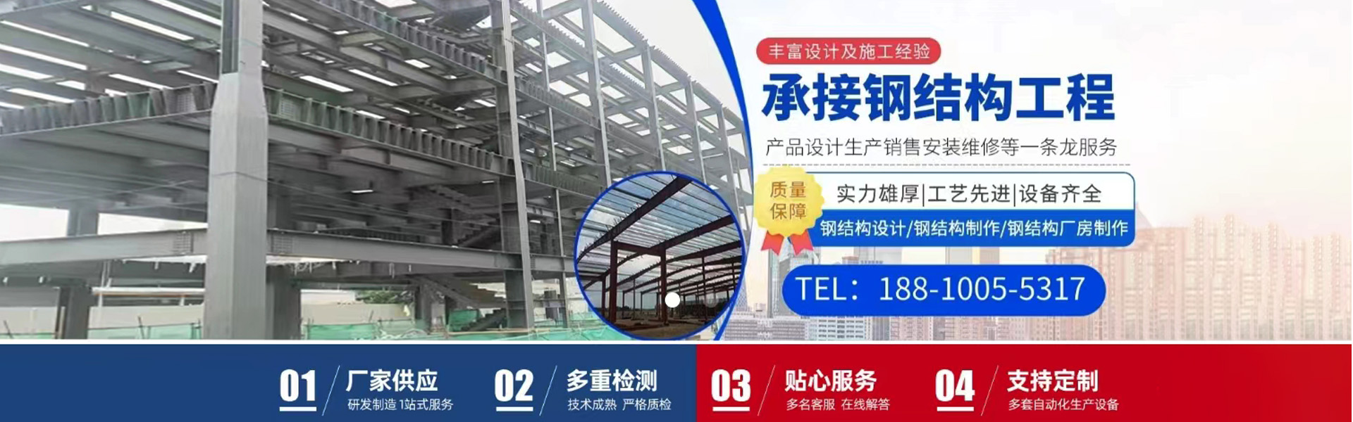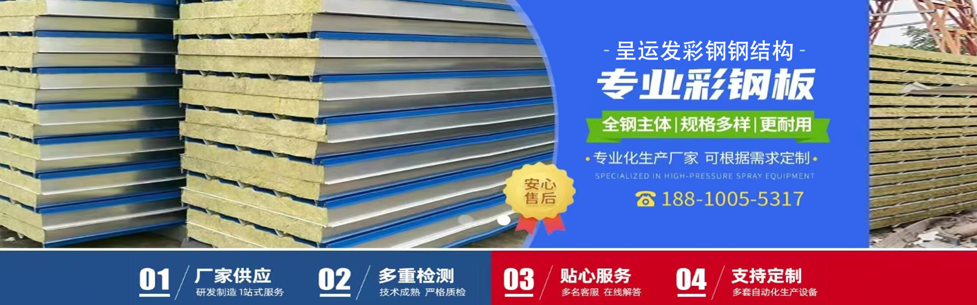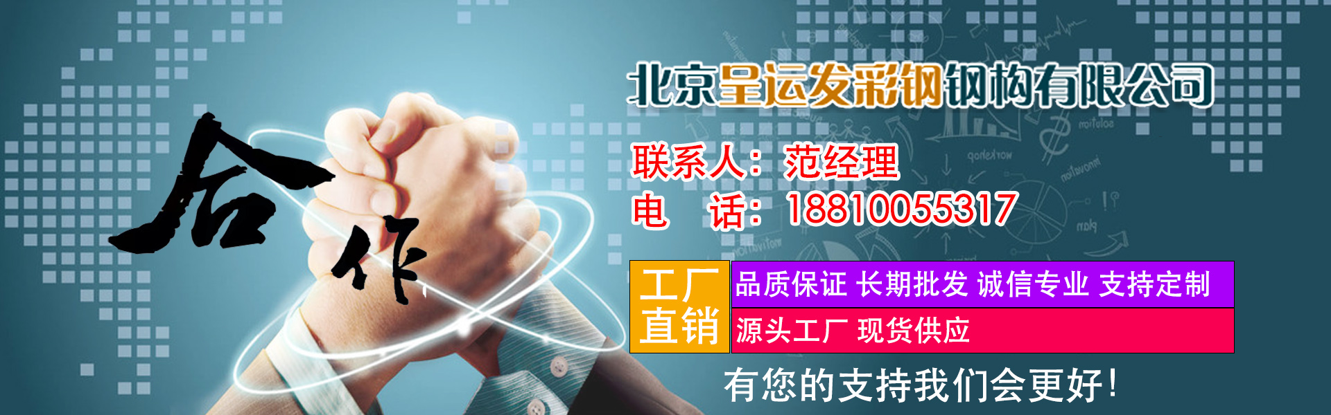 北京呈運發彩鋼鋼構有限公司是集鋼結構、彩鋼板設計、生產、加工、制造、銷售、安裝工程為一體綜合性企業。擁有鋼結構和彩鋼夾芯復合板的自動化生產流水線,各種型號彩鋼.壓型鋼板的壓型機,C.Z型鋼,鋼筋桁架樓承板等產品生產設備。 生產銷售各種型號規格的:新型聚氨酯夾芯彩鋼復合板,新型聚氨酯封邊防火棉夾芯彩鋼復合板,防火巖棉夾芯彩鋼復合板及其它芯材夾芯彩鋼復合板,鋁鎂錳合金板,鈦鋅板,鋼筋桁架樓承板,彩鋼壓型板,壓型鋼板,組合樓板,彩鋼仿古裝飾瓦,彩鋼壓花復合裝飾板,彩鋼防雨罩,彩鋼廣告扣板,弧形彩鋼瓦,彩鋼凈化潔凈板,冷庫板,圍擋板,住人集裝箱房,彩鋼活動房,集成房屋,C.Z型鋼,鋼結構等產品及配套附件。 專業承接各種:鋼結構,鋼結構廠庫房,鋼結構框架樓,鋼結構平臺隔層,鋼結構電梯井框架,鋼結構樓梯,鋼結構煤棚料棚,無梁彩鋼瓦屋頂,凈化車間,冷庫,樓房加層及屋面防水平改坡,鋁鎂錳.鈦鋅板建筑,彩鋼板和彩鋼活動房,集成房屋等工程。 我們秉承以質量求生存,以信譽求發展的理念,以優質的產品,貼心的服務與您精誠合作,共創美好明天。 生產 銷售 設計 制做 安裝工程一條龍服務!